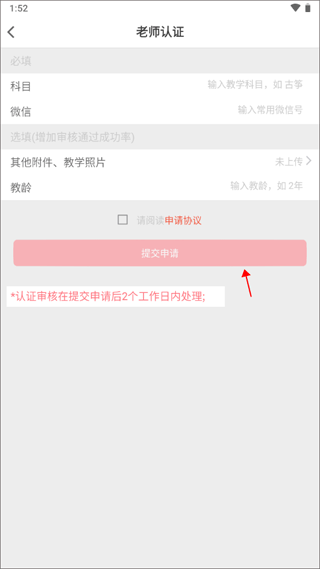 3、填写对应的信息,上传本人任教相关的照片与文档,勾选“请阅读申请协议”,最后点击提交申请即可。