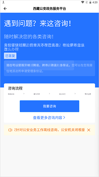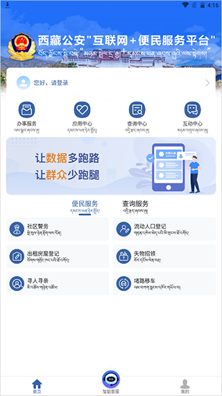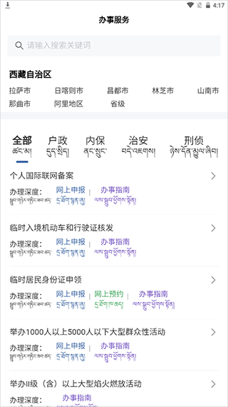 西藏公安政务服务平台是西藏自治区公安厅推出的一款“互联网+公安”政务服务软件,专门面向西藏自治区居民打造。该平台整合了无犯罪证明办理、机动车违法查询、出入境查询、户口办理等一系列实用的公安服务,并对这些服务进行了详细分类,还能为用户提供所需材料、办理机构等具体信息,从而大幅提升办事效率。