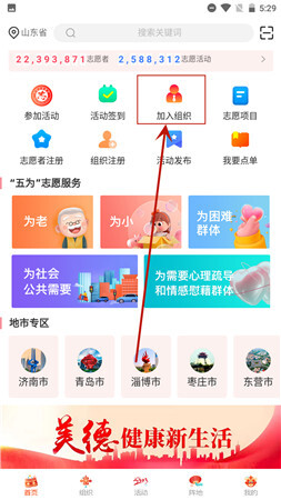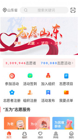 2、进入首页后,点击【五为志愿服务】专栏中的“五为”志愿服务活动,即可参与社会急需的志愿活动。