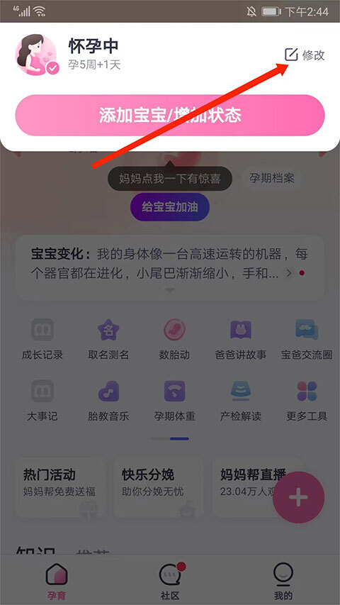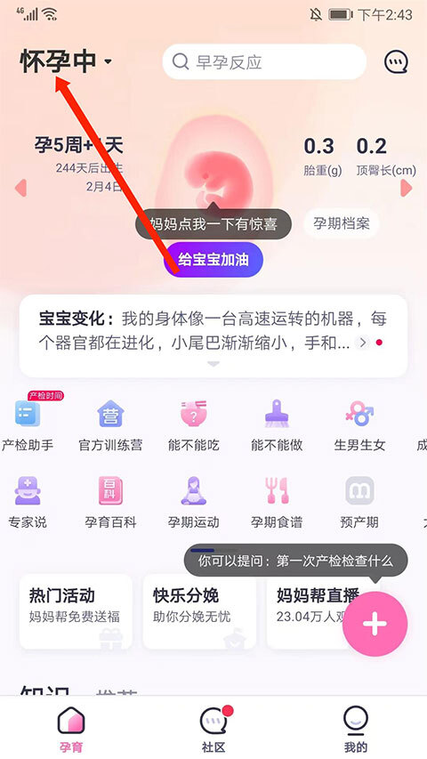 1、打开妈妈帮,选择左上角“怀孕中”状态栏选项,