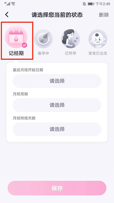 4、设置好“最近月经开始日期”、“月经周期”和“月经持续天数”后,选择下方“保存”选项,即可切换成月经模式。