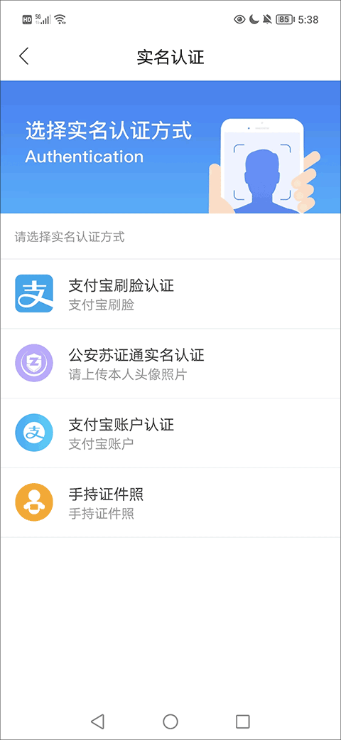 3、接下来,用户需在实名认证界面从四种认证方式里选择其中一种来完成认证。