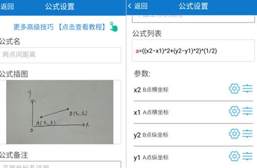 1、 拿“两点之间的距离”来举例,第一步要点击自定义按钮,对两点之间的距离公式进行编辑。两点距离公式我们是清楚的:把同名坐标的差值求出来,平方之后相加,再开平方就是距离。假设A点的坐标是(x1,y1),B点的坐标是(x2,y2)。