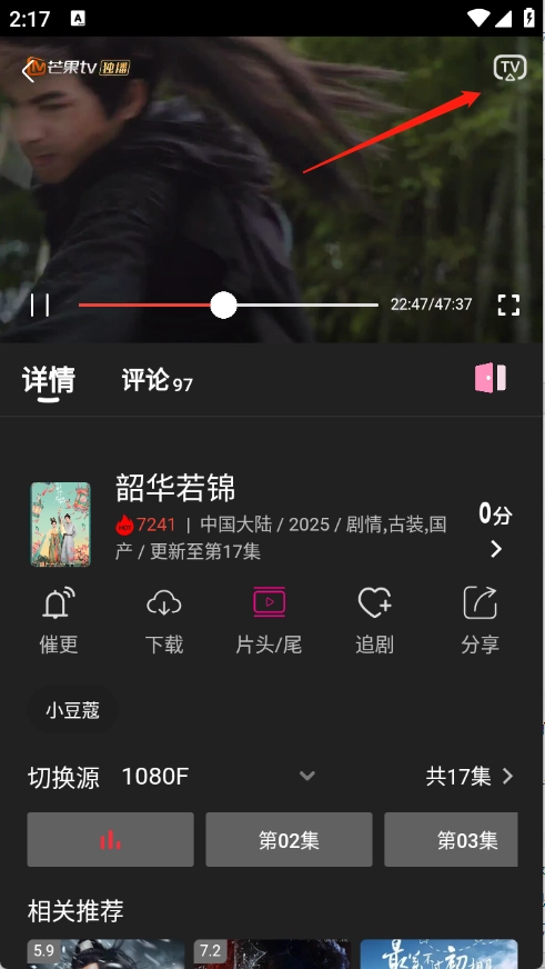 1、用户打开想要观看的影视资源后,点击右上角的“TV”按钮。