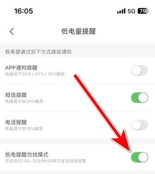 4、打开按钮,即可开启低电提醒勿扰模式。