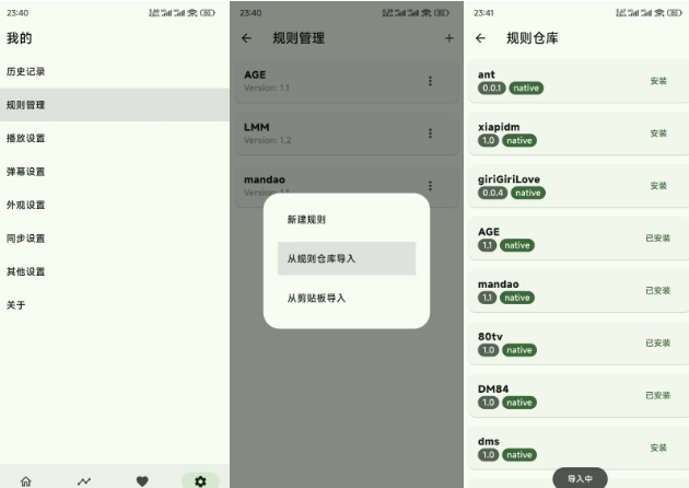 3. 进入「规则设置」页面,点击右上角的添加按钮,选择从规则仓库导入,导入其他规则时注意不要一次性添加过多,以免导致网络异常。