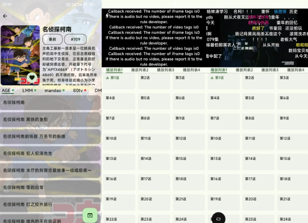 4. 直接搜索你想看的动漫,选择不同的资源源进行播放就可以了。点开视频播放页面后,会出现一行一行的文本,这是视频正在加载的页面,属于正常现象。如果等待半分钟后还是不行,系统会提示加载失败。