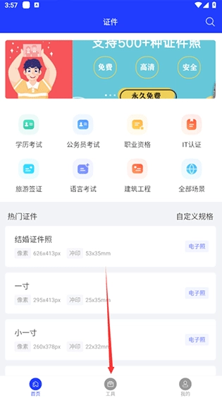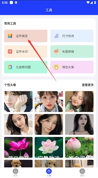 3、进入【工具】页面后,你可以按照自己需要的功能进入编辑图片,我们这里演示一下【证件换底】功能;
