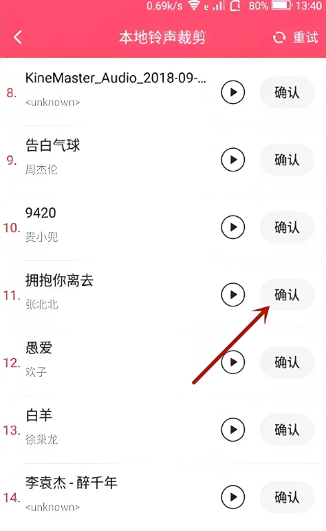 2、挑选一首自己已准备好的本地歌曲,接着点击“确认”按钮,操作方式如图所示;