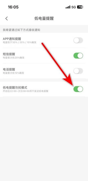 4、第四步:打开按钮,即可开启低电提醒勿扰模式。