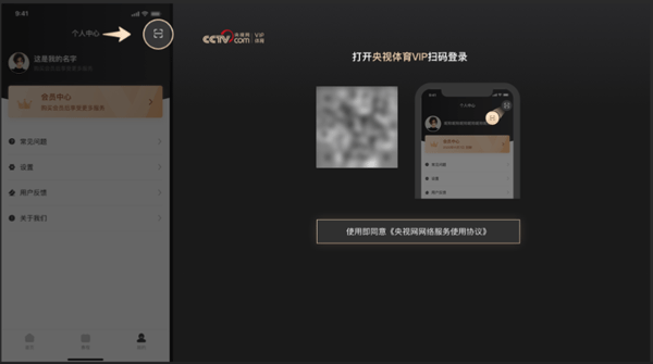 1、打开央视体育VIP ,在我的页面内点击右上角扫一扫功能,扫描tv版上的登录二维码即可