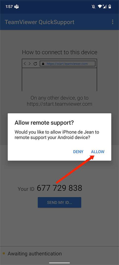 2、在被控制端的上会弹出一个远程控制确认,选择“ALLOW/允许”选项,