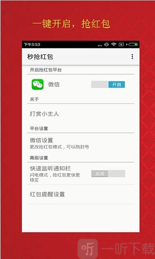 微信自动抢红包神器是一款能帮用户自动抢微信红包的工具,当用户觉得自己手速不够快时就能用它,一键就能启动,还能设置抢红包的时间间隔和速度,同时可以开启提醒功能,有红包时会第一时间通知用户,让用户再也不会错过任何一个红包。