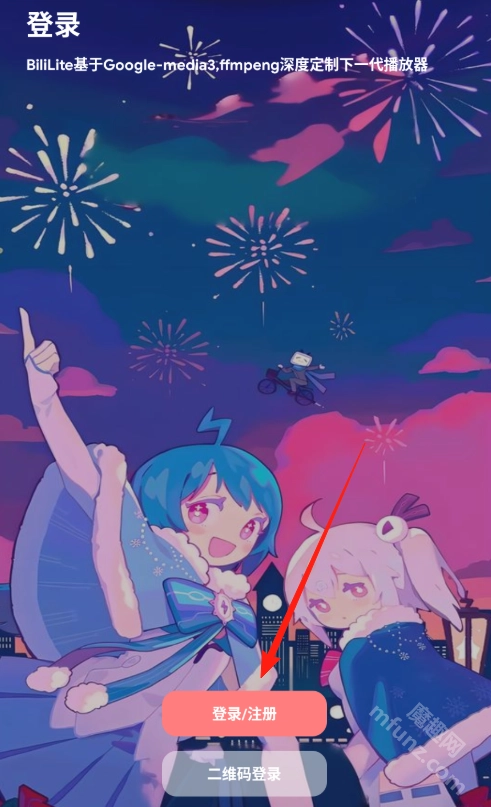 1、打开BiliLite后点击登录/注册按钮,可选择通过B站账号或其他指定账号进行登录。