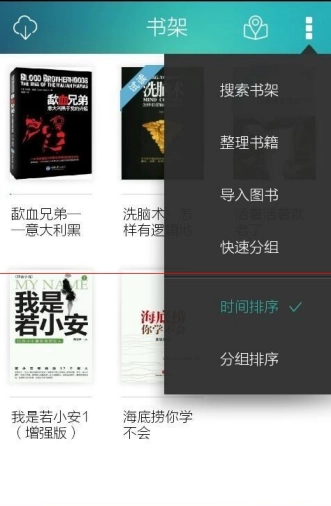3、咱们点击书架,就像下面的图展示的那样。咱们可以进行【搜索书架】、【收拾书本】、【导入图书】、【快速分组】、【时间排序】和【分组排序】这些操作。