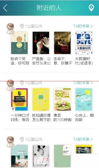 12、进来【附近的人】,如下图所示。咱们可以查看TA的书架,还能知道TA是在1公里以内还是1公里以外。