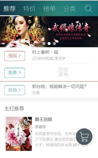 13、我们可以点击【书城】,就像下面的图片展示的那样。在这里能看到【推荐】、【特价】、【榜单】和【分类】这些板块。