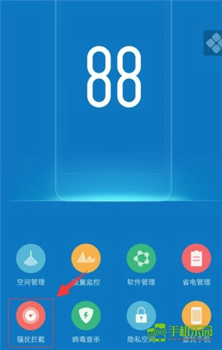 1、并vivo管家后打开,进入主界面点击左下角的骚扰拦截的图标选项;