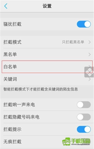 3、然后,在设置中点击白名单的选项进入;