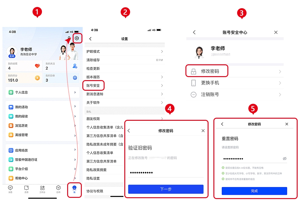 2、端:登录后,您可在下方导航栏依次点击【我】-【设置】-【账号安全】-【修改密码】,先输入旧密码完成验证,再设置新密码。