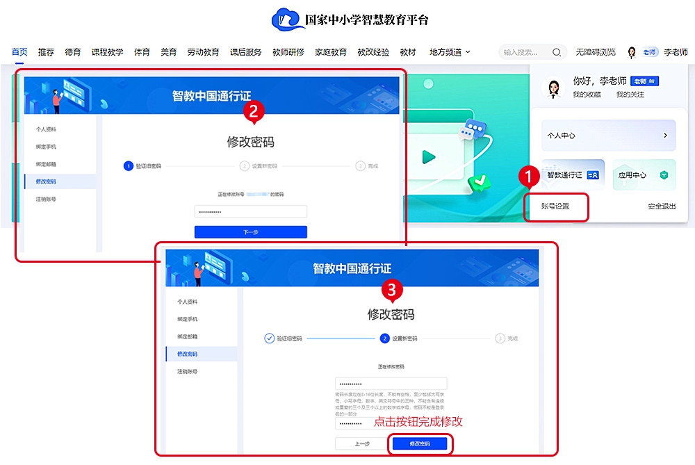 1、网页端:登录后,您可点击首页右上角的【账号设置】,进入后选择【修改密码】,先输入旧密码完成验证,接着设置新密码即可。