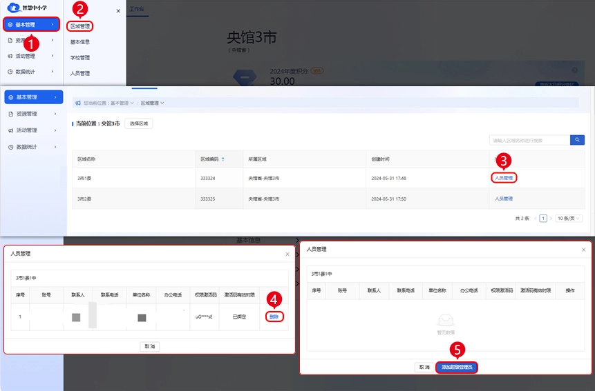 1、若需要更换区域超级管理员,您可联系上级区域管理员,先通过【基本管理】-【区域管理】-【人员管理】删除原超级管理员,再通过【添加超级管理员】功能重新生成对应权限的激活码,并将该激活码发送给新管理员完成绑定操作。