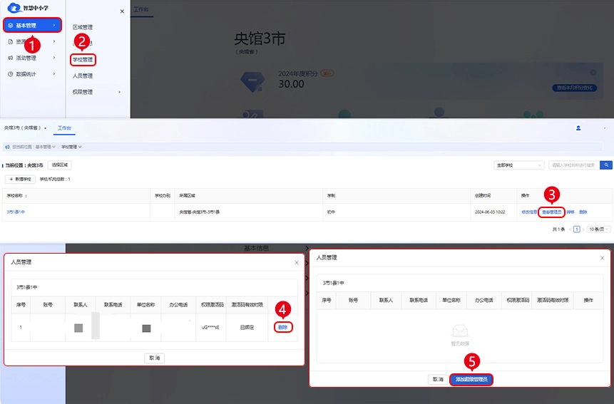2、若需更换校级超级管理员,您可联系上级区域管理员,由其通过【基本管理】-【学校管理】-【查看管理员】删除原超级管理员,随后通过【添加超级管理员】重新生成对应权限的激活码,并将该激活码发送给新管理员完成绑定操作。
