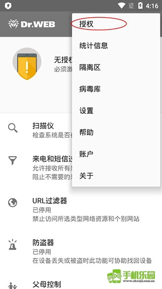 1、大蜘蛛杀毒软件(Dr.Web),启动程序后,初始状态显示为“无授权”,此时点击界面右上角的菜单按钮,从中选择“授权”这一选项。