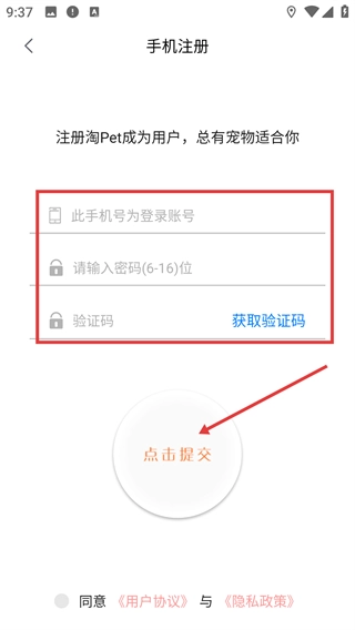 4、在注册页面,填写号码、设置6-16位的密码、获取并输入验证码,勾选相关协议后点击【点击提交】按钮,即可完成注册流程。