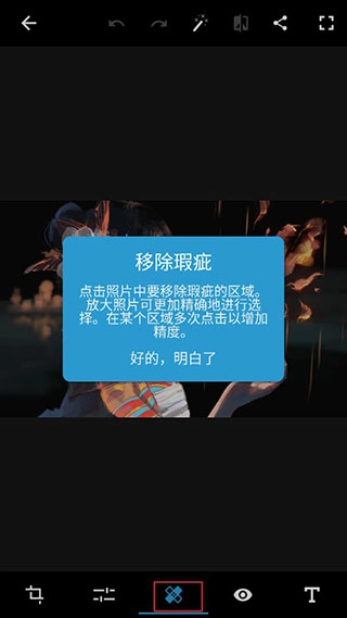 4、点击“移除瑕疵”功能后,只需点击照片中需去除瑕疵的区域即可操作;放大照片能让选择更精准,在同一区域多次点击还可进一步提升处理精度。