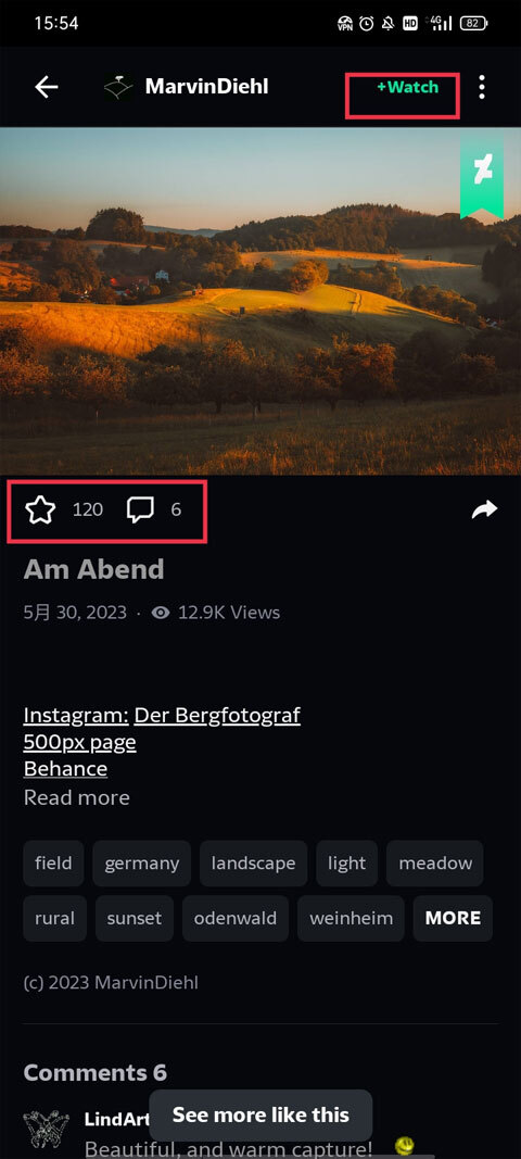 3、当你登录成功后就可以收藏并评论自己喜欢的绘画、素描等照片,你还可以点击右上角的“+Watch”进行分类,更好地管理图片。