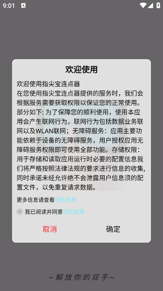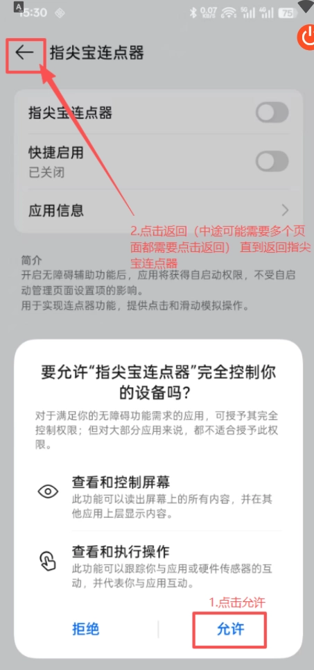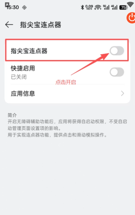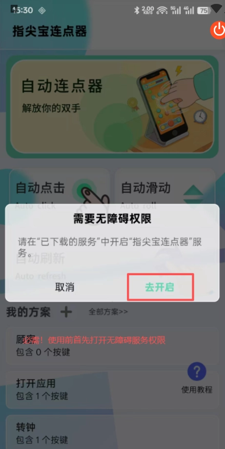 2、进入主页后,开启“自动点击”功能时会提示需要开启无障碍权限,这意味着使用该功能前需先打开无障碍服务权限。