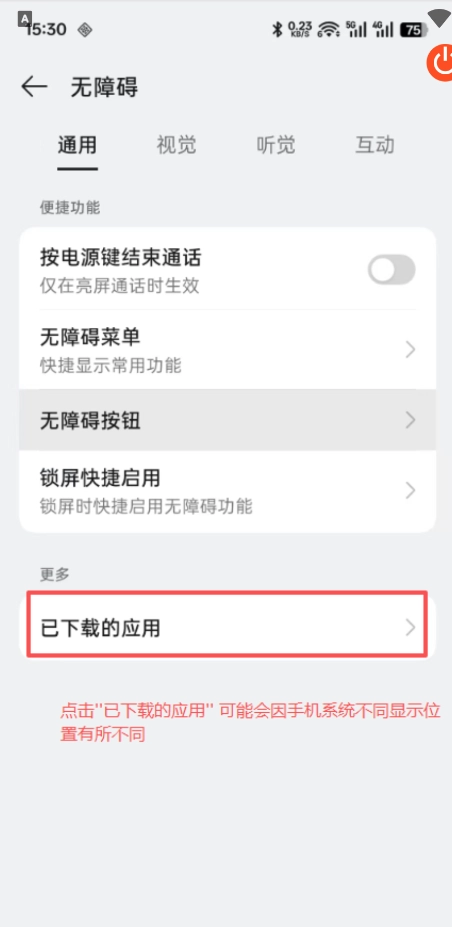 3、在无障碍页面打开"已的应用",音系统不同显示的位置有所不同。