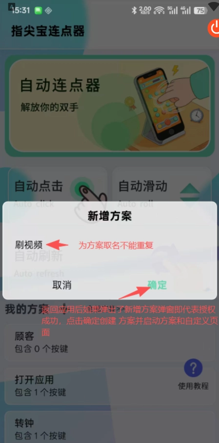 7、返回应用后,若弹出新增方案的弹窗,即表示授权成功,此时点击确定,即可创建方案并启动方案与自定义页面。
