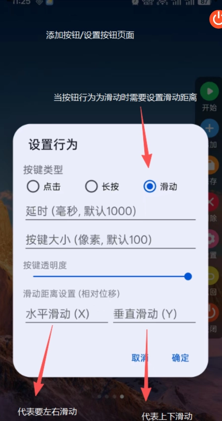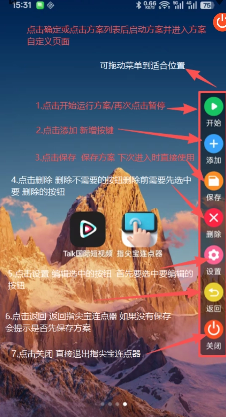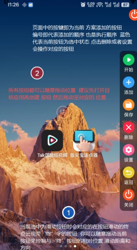 10、最后页面上的按键就是当前方案添加的按钮,编号既代表添加顺序,也是执行顺序;蓝色表示当前按钮处于选中状态,点击“删除”或“设置”会对对应的按钮进行操作,完成这些步骤后就能开启点击功能了。