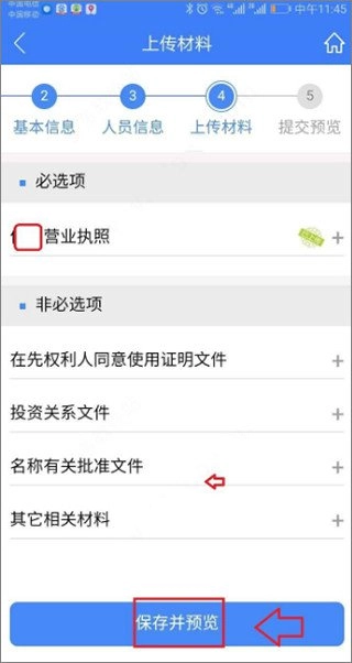 6、在上传资料环节填写营业执照信息及相关文件,完成后点击保存并预览。