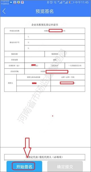 7、确认登记申请书信息无误之后点击开始签名。