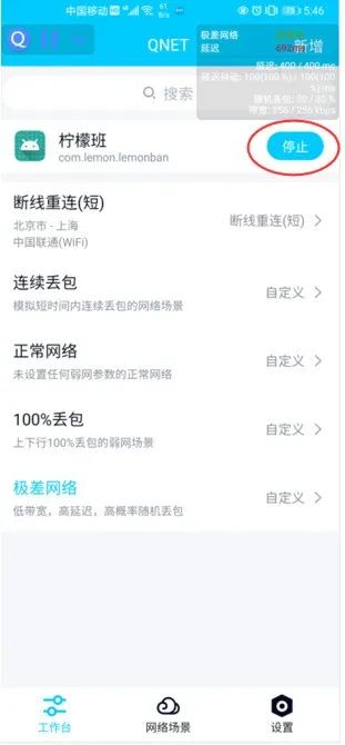 测试完成后,双击[控制悬浮窗]里的Qnet图标,就能回到Qnet【工作台】页面,接着点击停止按钮即可。