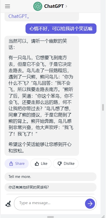 6、ChatGPT借助AI技术实现智能回复与对话交互。需注意的是,该平台以英文为基础,用户需使用英文开展聊天沟通。此外,平台可能需要一定时间来学习和适配您的语言习惯,所以建议用户保持耐心并多尝试使用。