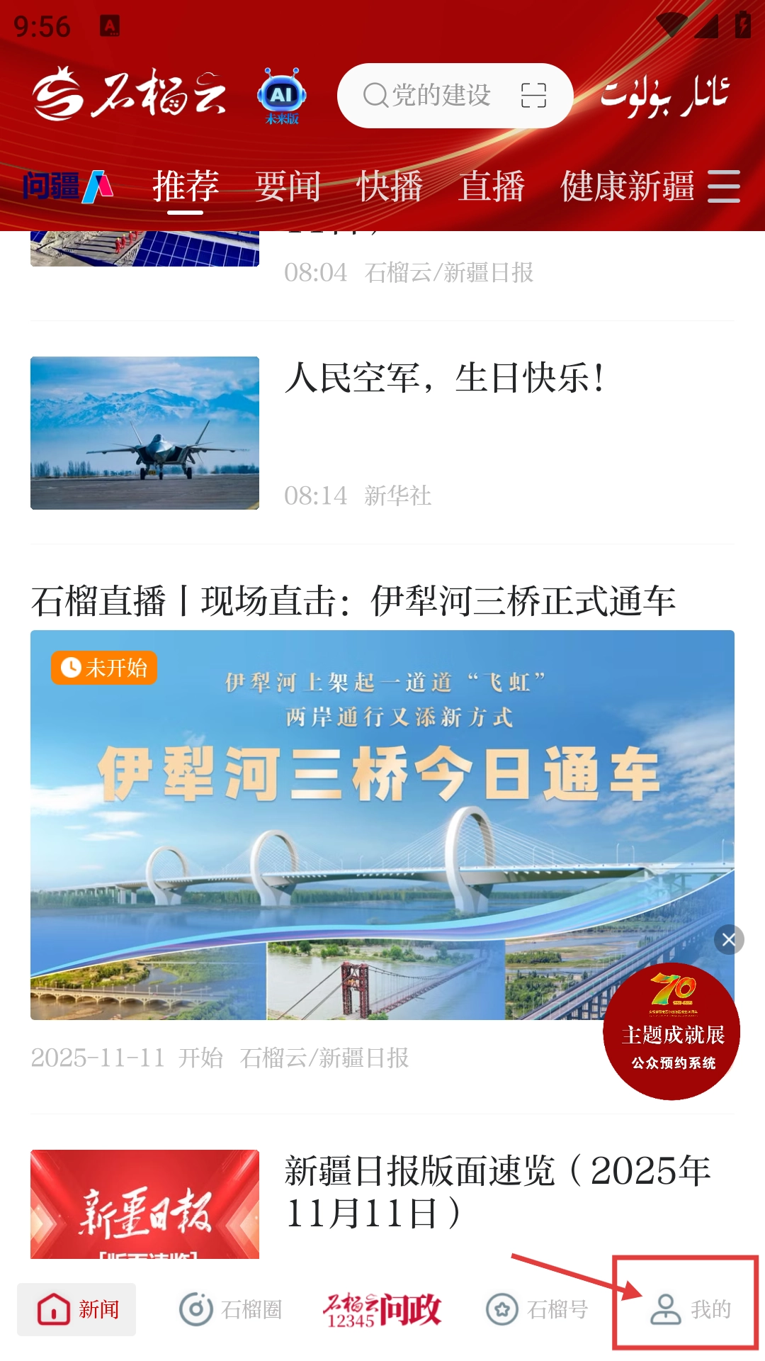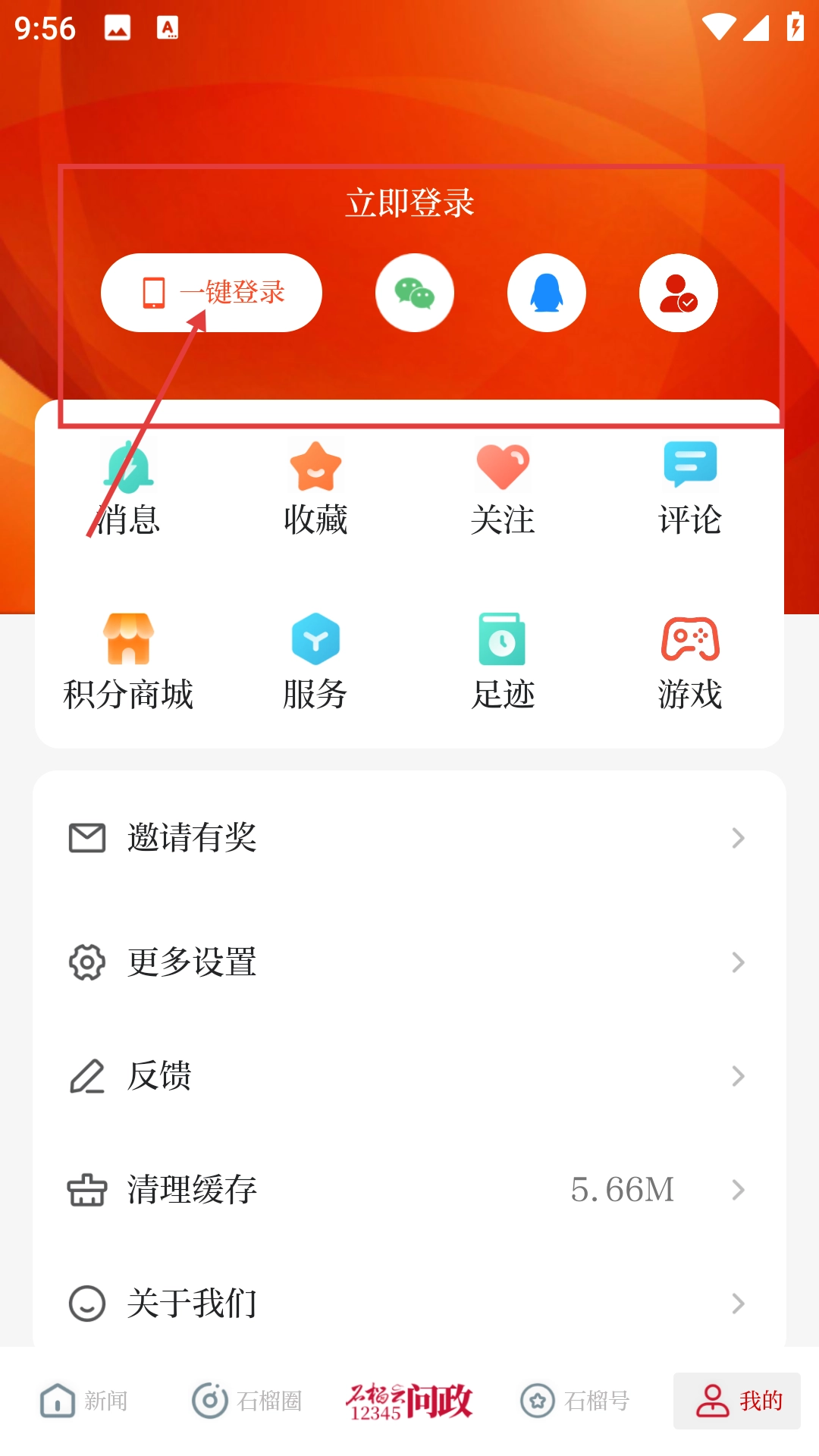 1、在石榴云新闻首页,点击右下角的【我的】按钮,就能进入个人相关功能界面,方便进行登录等操作。