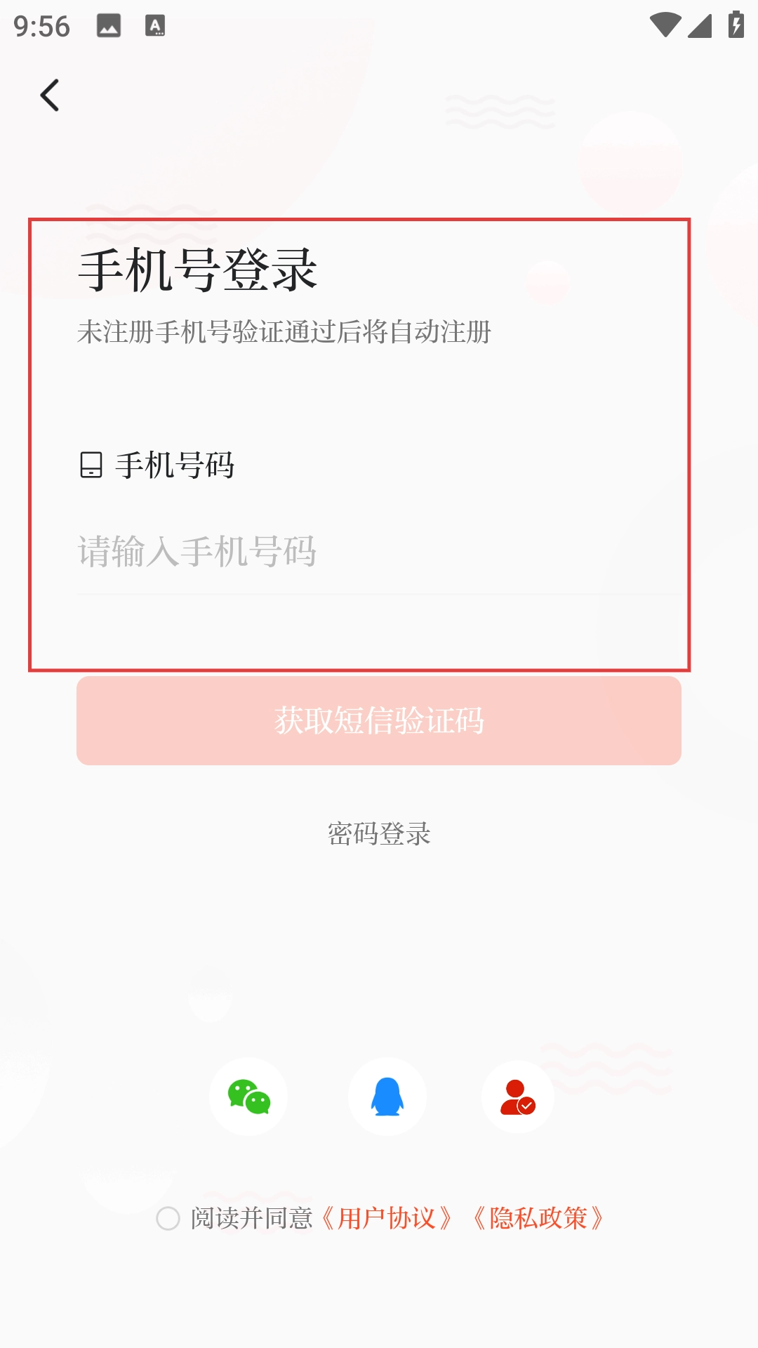 3、选择号登录方式后,在【请输入号码】输入框中填写号,然后点击【获取短信验证码】。