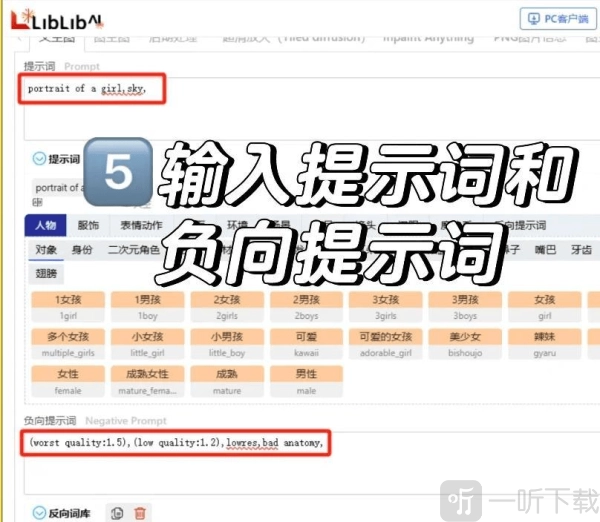 5. 输入提示词和负向提示词。