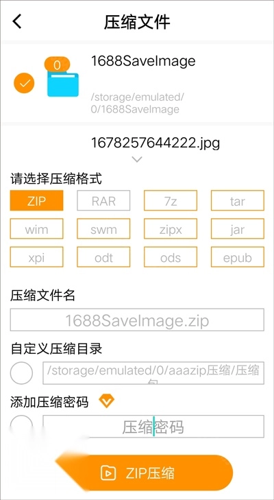 1、启动全能zip解压缩工具,点击首页的【文件压缩】功能选项 2、进入文件选择界面,挑选要进行压缩的文件