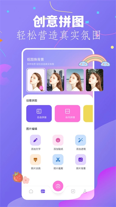 ①、海量素材 ,我们为用户提供了专门的素材库用于照片编辑,用户可以根据照片的风格进行相应调整;