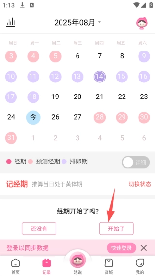2、输入后,点击“月经开始”,然后设置相应的时间。