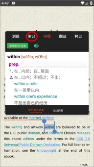 2、打开进入用户阅读的电子书页面,用户选择需要添加书签的句子或单词,点击笔记;