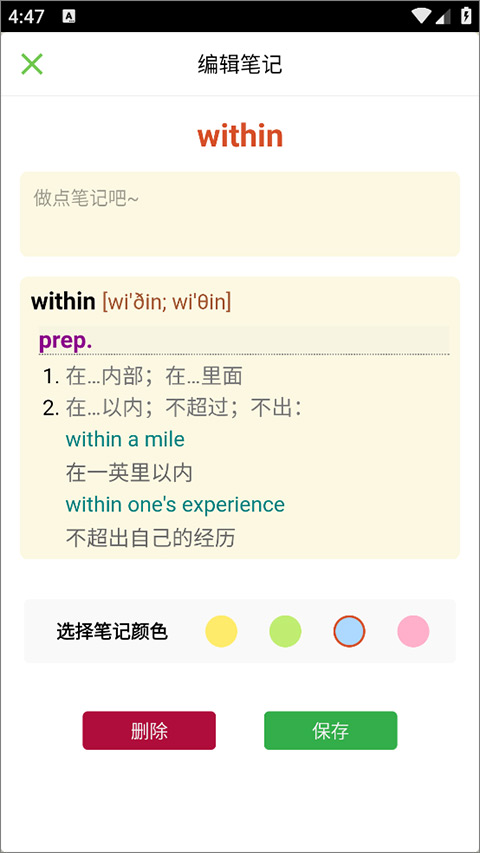 3、用户即可进入笔记编辑页面,用户输入标签内容,可设置笔记颜色等,点击保存即可。