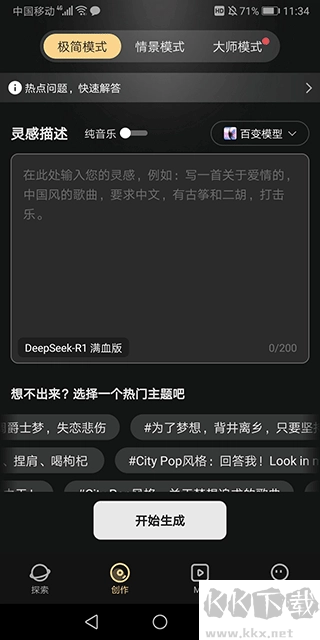 2、创作模式丰富多元:涵盖极简模式的便捷高效、情景模式的情感沉浸式体验、大师模式的深度个性化定制等多种类型,能够适配不同创作水平与多样化需求。