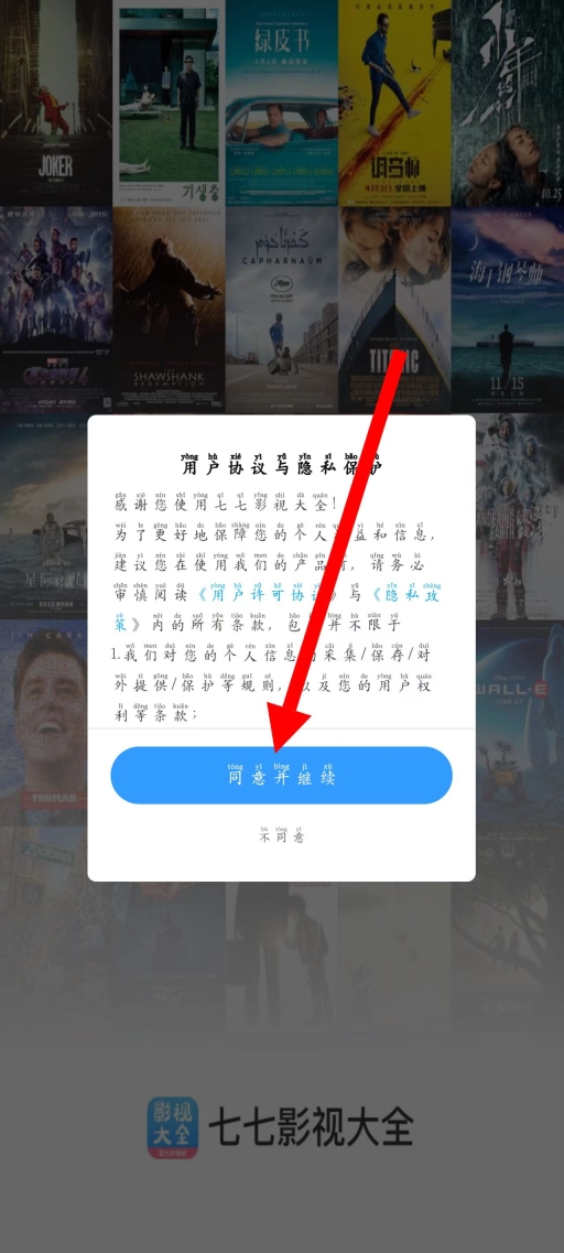 1、打开七七影视大全,在弹窗中点击同意并继续。