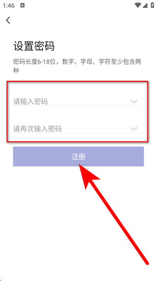 5、在设置密码页面,按要求输入并确认密码,点击注册,完成操作。